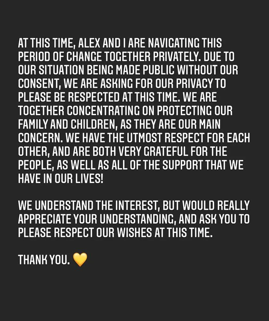 Soon after, Alex turned his Instagram account to private while Teigan took to hers to reveal the deep pain caused by the fact their “split had been made public without our consent”.