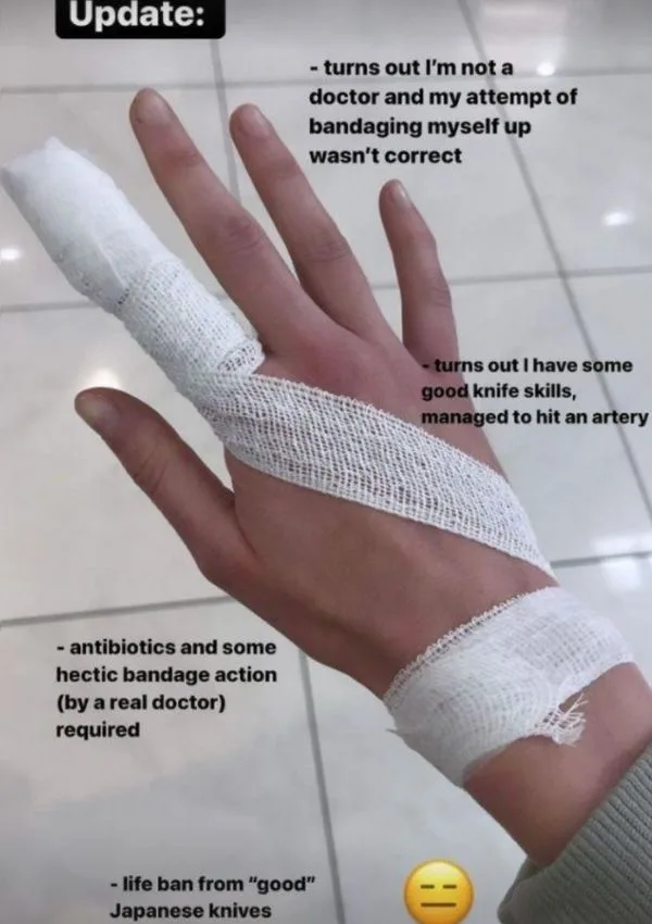Bec managed to slice open her hand while attempting to make dinner with Japanese knives, and she documented her bandage journey on her Instagram.