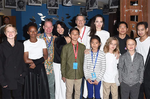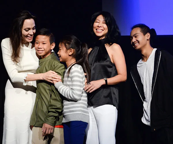 Angelina, who was promoting her latest film First They Killed My Father at the film festival, cuddles up to actor Kimhak Mun, actress Sareum Srey Moch, executive producer and screenwriter Loung Ung and executive producer and her son Maddox Jolie-Pitt.