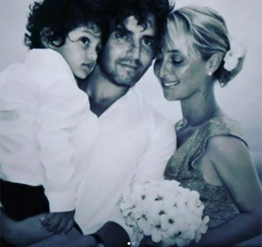 This first snap (below) is from their 2014 wedding day on Turtle Island in Fiji and shows the actress in an elegant beaded gown, holding onto her bouquet and cuddling up to her husband and his son Luca.