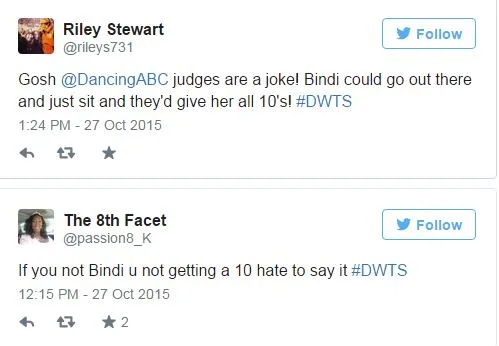“If you not Bindi u not getting a 10 date to say it #DWTS”, tweeted another.