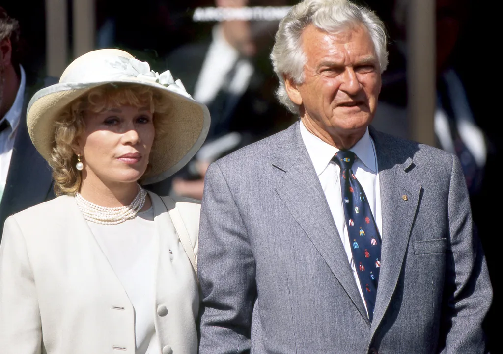 Former Australian Prime Minister Bob Hawke with wife Blanche d’Alpuget at Moonee Valley Racecourse in Melbourne, 1995.