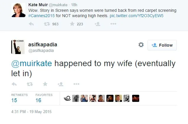 Although an official spokesperson for Cannes has refuted these claims, they were corroborated by Amy director, Asif Kapadia, who said that his wife had initially been refused entry for her flat shoes, but was eventually let in.