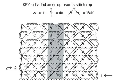 2nd Row: 6ch, 1dtr in first st, ‘Pair’, patt to end.