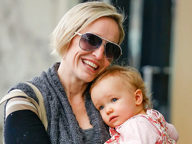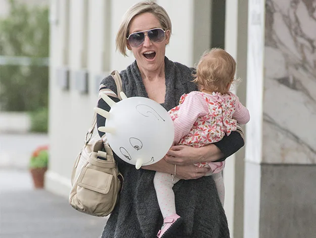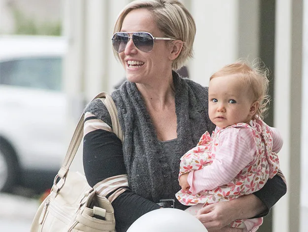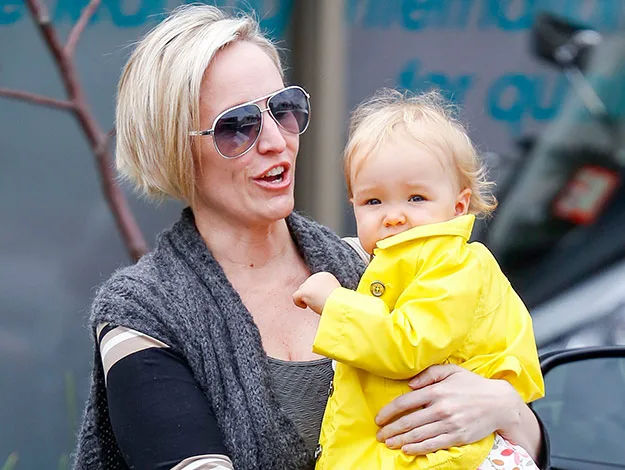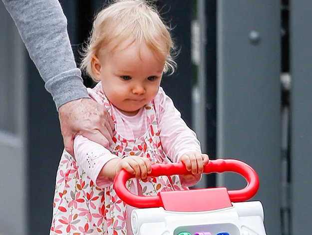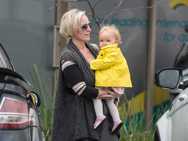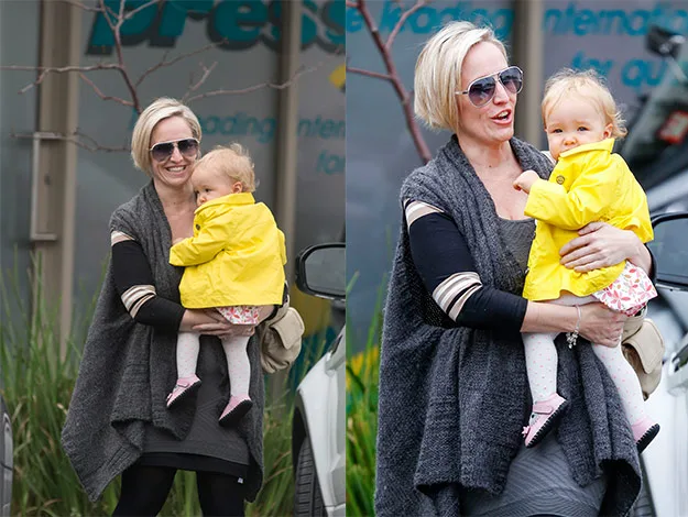 While proud mum Fifi kept things stylishly casual in stockings, an overthrow and aviator sunglasses, her precious cargo looked pretty in a pink floral dress which she later topped off with a bright yellow rain coat,