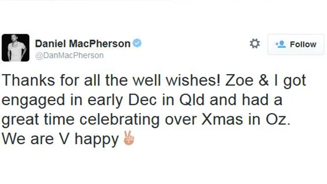 Former Neighbours star Daniel MacPherson has confirmed via Twitter that he’s engaged to his long-term actress girlfriend Zoe Ventoura.