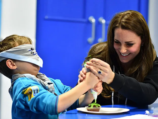 The Duchess of Cambridge puts on a blindfold to ice a cake.