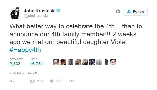 “2 weeks ago we met our beautiful daughter Violet #Happy4th.”