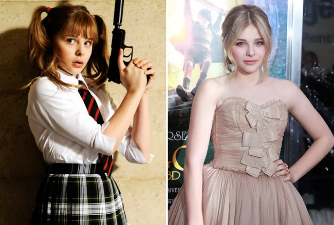 Chloe Moretz as Hit Girl in *Kick-Ass* and in New York in December 2011.