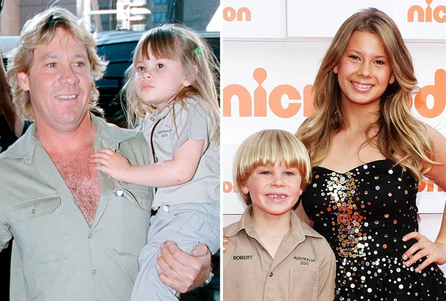 Bindi Irwin with her dad in 2002, and on the red carpet with brother Robert in October 2011.