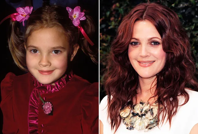 A pigtailed Drew Barrymore in 1982 and 2011.