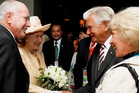 Bob Hawke welcomed Queen Elizabeth II to Australia alongside his wife Blanche and John Howard at the Opening Ceremony for the Melbourne 2006 Commonwealth Games.
