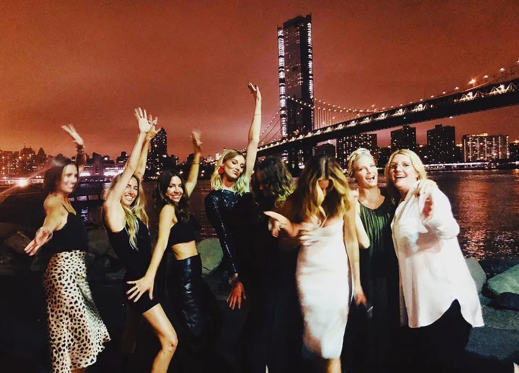 The 34 year-old shoe designer shared a snap to Instagram of herself and some girlfriends letting their hair down with a backdrop of New York’s famed Brooklyn Bridge.