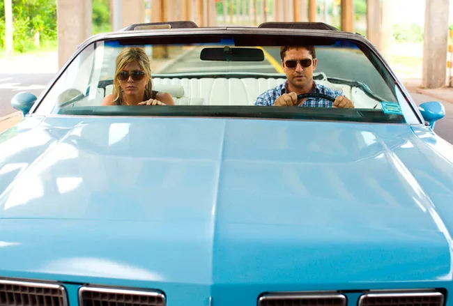 The pictures were taken by photographer Steven Klein and are of Aniston counting wads of cash in the front seat of a car and Gerard dressed as a police officer.