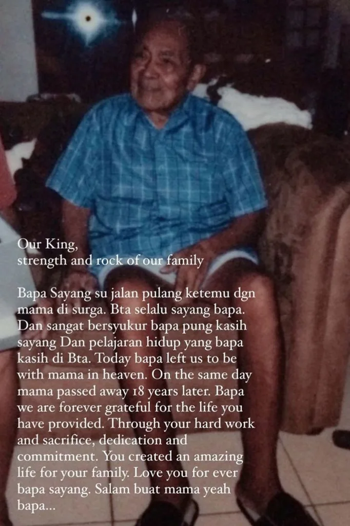 (Instagram)“Today Bapa left us to be with Mama in heaven. On the same day Mama passed away 18 years later,” she penned.