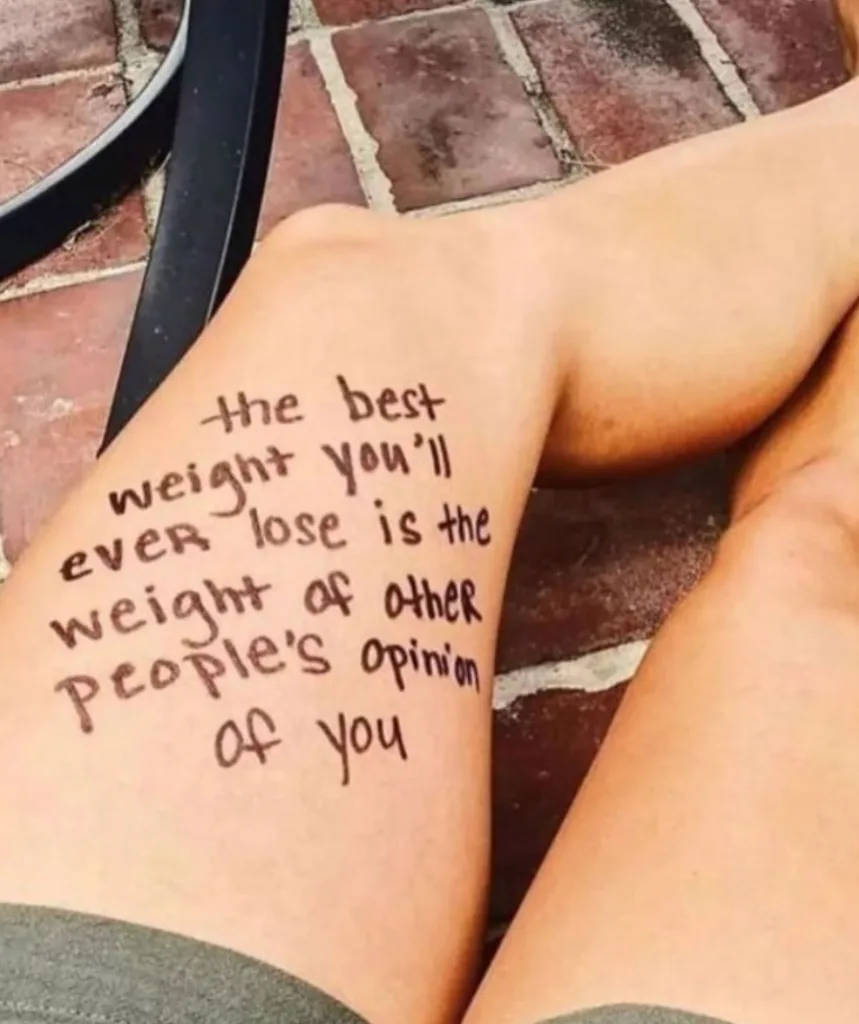 The image shows a woman’s leg with a message written on it: “The best weight you’ll ever lose is the weight of other people’s opinion of you”.