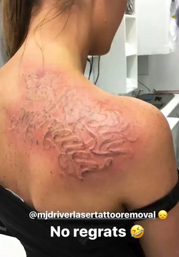‘So for everyone asking about my tattoo removal, I’ve been getting it removed for over two years and I only go every couple of months,” she said, along with posting a picture of the sem-removed tatt, captioned: “No regrats [sic]”.