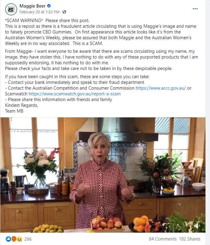 Fake stories published online show Maggie Beer appearing to promote CBD gummies, including a phony interview doctored to look like it has been published by The Australian Women’s Weekly.