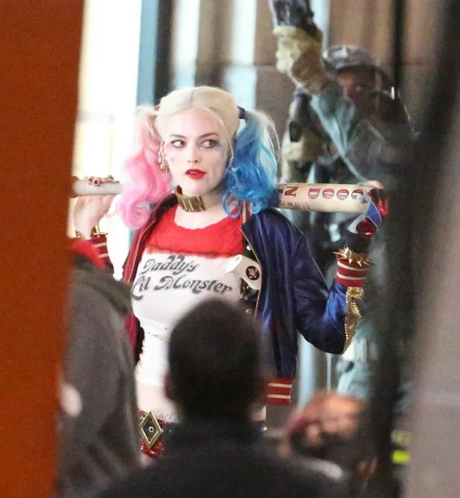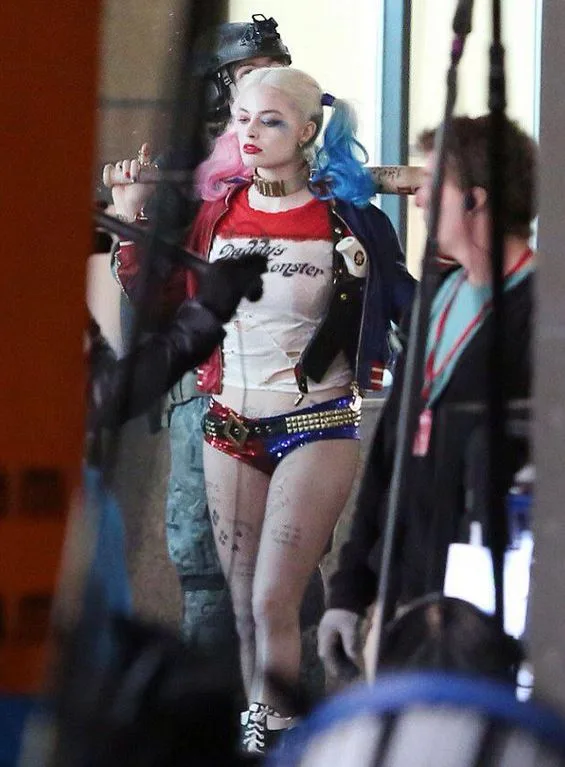 Margot Robbie looked the part on set, baseball bat in hand wearing in red and blue hot pants.