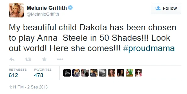 She might not be seeing the film, but she is her daughter’s biggest supporter. Taking to twitter she is regularly tweeting her support for Dakota!