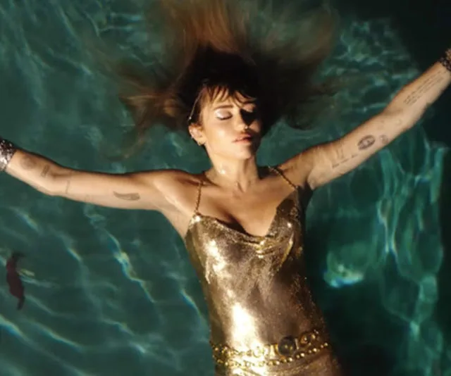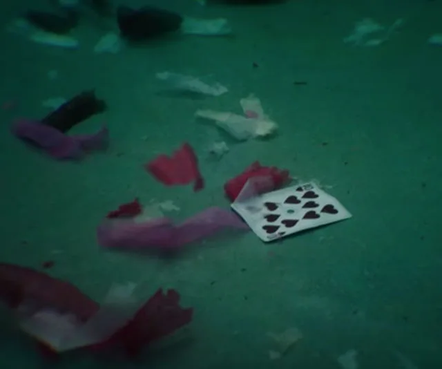 First spotted by Cosmopolitan, a 10 of hearts playing card can be seen at the bottom of a pool as Miley floats sadly in the water.