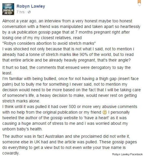 It comes after a story was written a year ago, reading, “Robyn considers abortion to avoid stretch marks.”