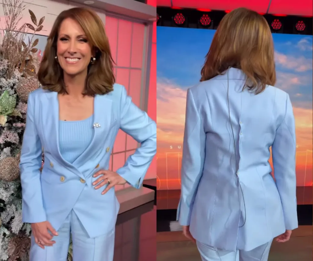 The video frame zooms in and it appears that the Sunrise host and her on-set stylist has been crafty with some safety pins, a row going down her back, cinching in the fabric which then from the front makes the blazer appear tailored.