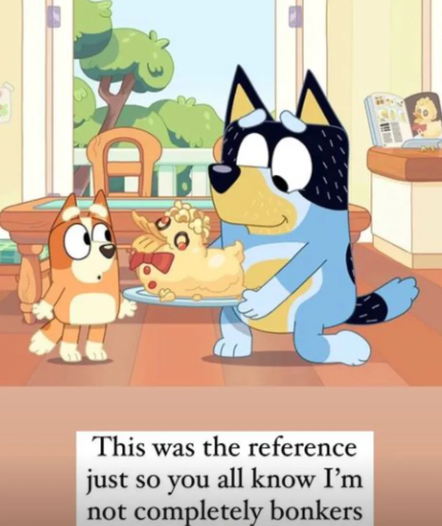 “This was the reference just so you all know I’m not completely bonkers,” she captioned the following story which featured a screenshot of the cake as it appears in the cartoon Bluey.
