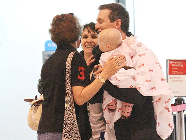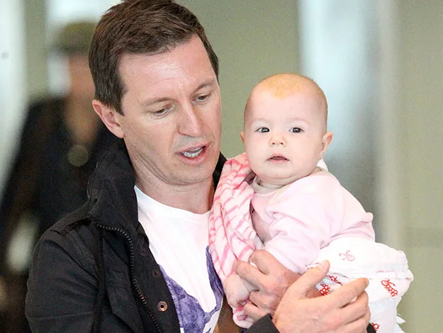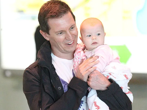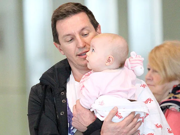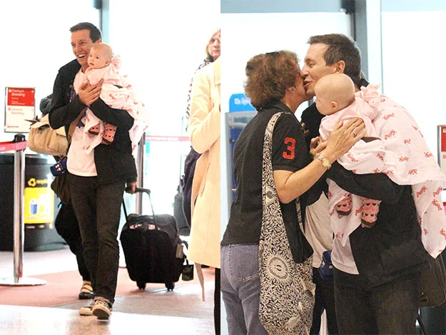 The Australian comedian turned TV presenter looked every inch the proud father as he cradled his first-born child, who was wrapped in a pink and white blanket, in his arms through Sydney International Airport.