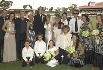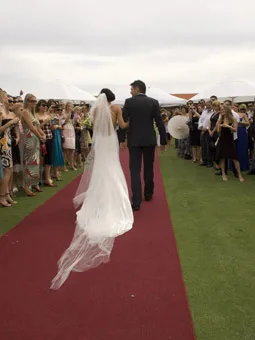 Belinda’s brother Brad walked her down the ‘aisle’ — a wide red carpet out on the field.