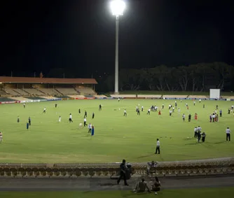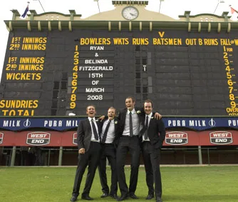 Fitzy and groomsmen — best man Matt Semple and groomsmen Matt Ericson and John Kindstrom — strike a pose beneath his customised scoreboard!