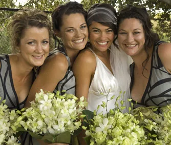 Belinda and her bridesmaids — Nikki Irons, Abby Peckover and Tracy Bache — cosy up among the gorgeous flowers.