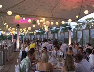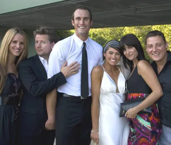 Reception hosts, radio comedians Merrick Watts (right with wife Georgie) and Tim Ross (left with wife Michelle) kept the party laughing.