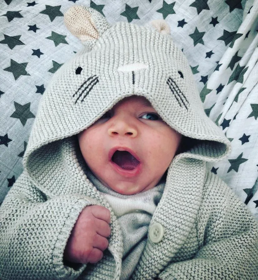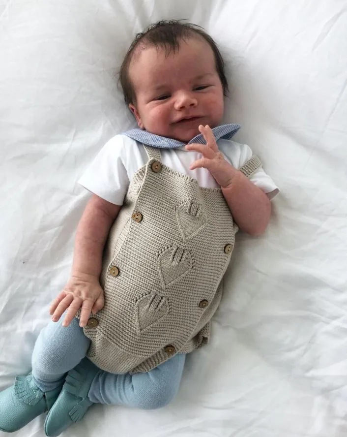 “Look at that smile….Theodore you are my world 💙💙💙,” the TV presenter and model captioned her snap of Theodore, dressed in knitted overalls.