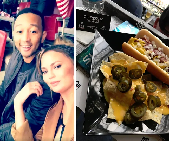 Chrissy and John are all set for the game, with mum-of-one sharing the most important thing… Her nachos and hot dog!