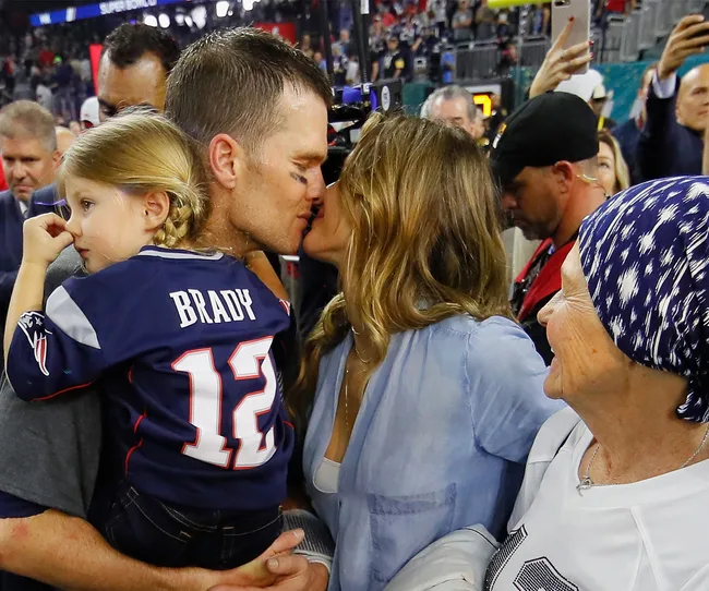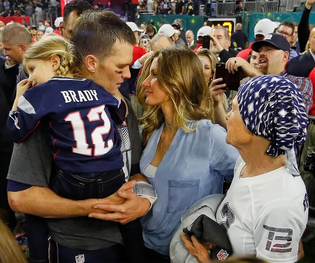 What a moment! Shortly after Tom Brady’s team, the New England Patriots, beat the Atlanta Falcons 34-28, the star quarterback was joined by his wife Gisele Bündchen, four-year-old daughter Vivian, seven-year-old son Benjamin and his mother Galynn Brady.
