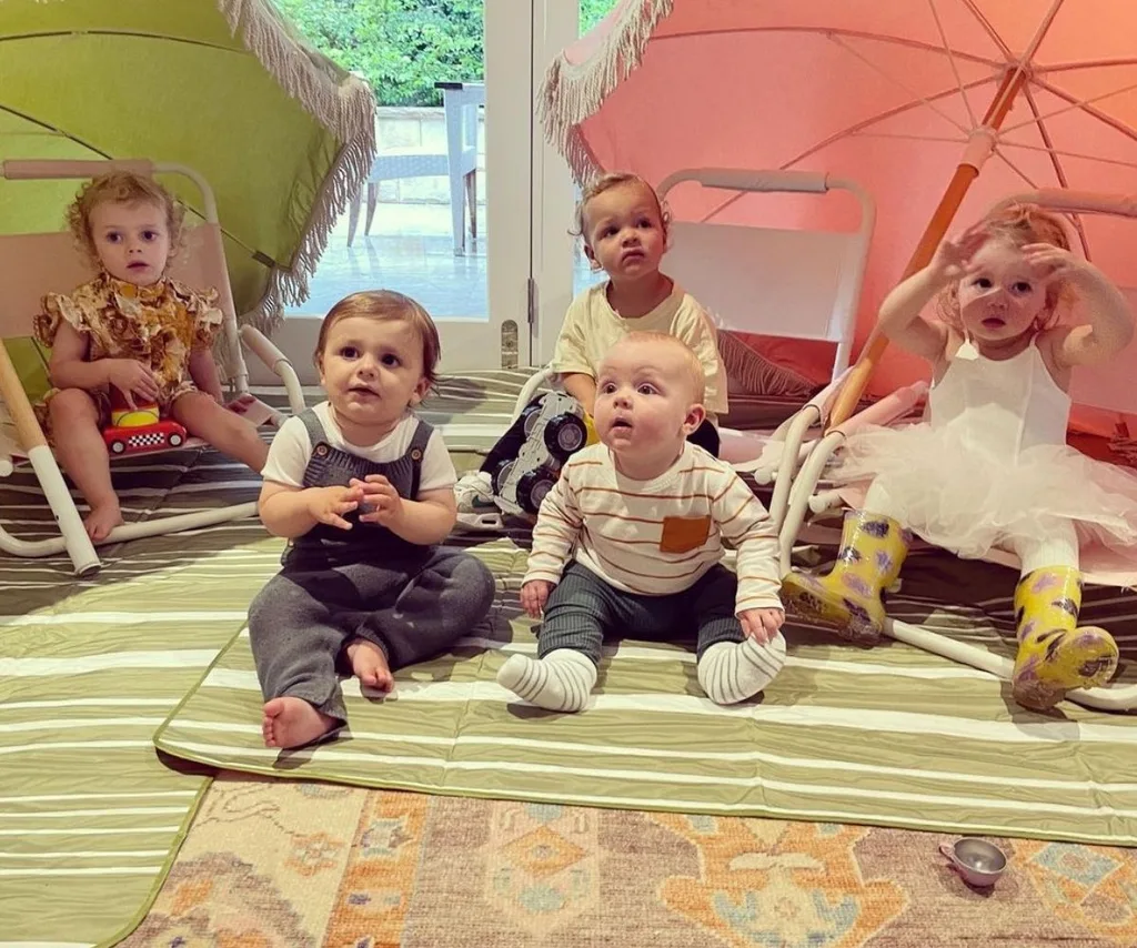 In the too cute to handle snap shared on several accounts, Phoenix, Sylvia and Peter’s sons Oscar and Henry as well as Karl and Jasmine Stefanovic’s daughter Harper sit together.