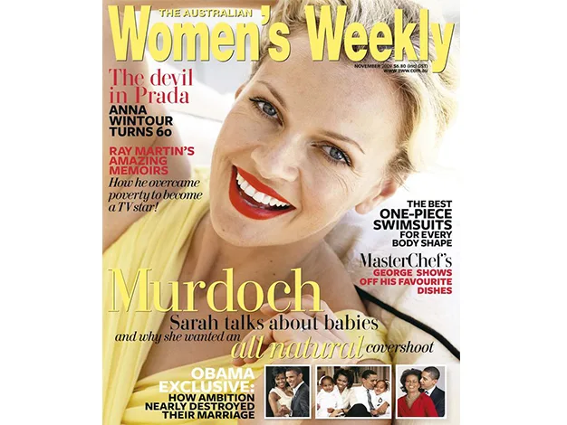 Sarah Murdoch appeared on the November 2009 cover in an untouched photograph. She said women should be able to embrace the beauty of ageing.