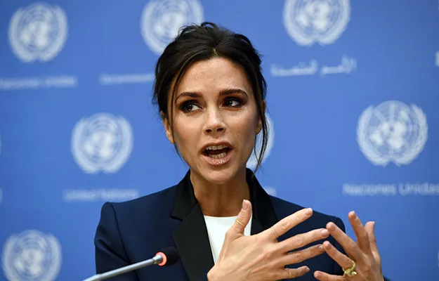 Victoria Beckham speaks to the audience at the UN headquarters in New York.