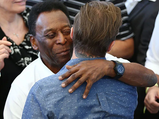 Two football legends united: David Beckham hugs legendary player Pele at the final.