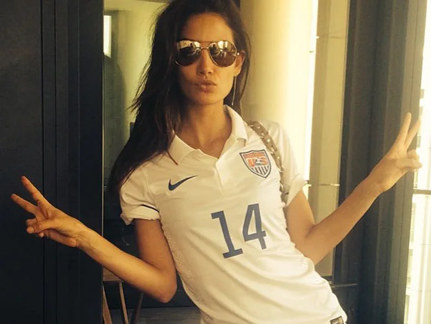 Model Lily Aldridge throws some peace signs the way of team USA.