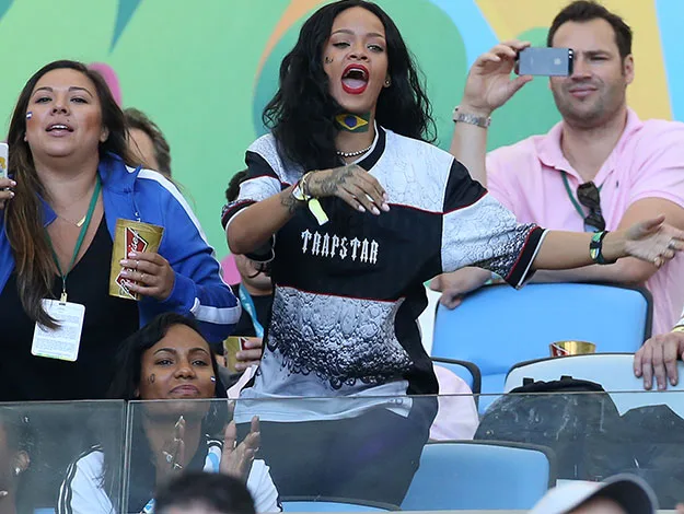 Rihanna has been one of the most prolific Tweeters throughout the World Cup, showing support for multiple different teams throughout the duration. Here she cheers on Argentina and Germany at the final while wearing a Brazilian flag painted on her neck.