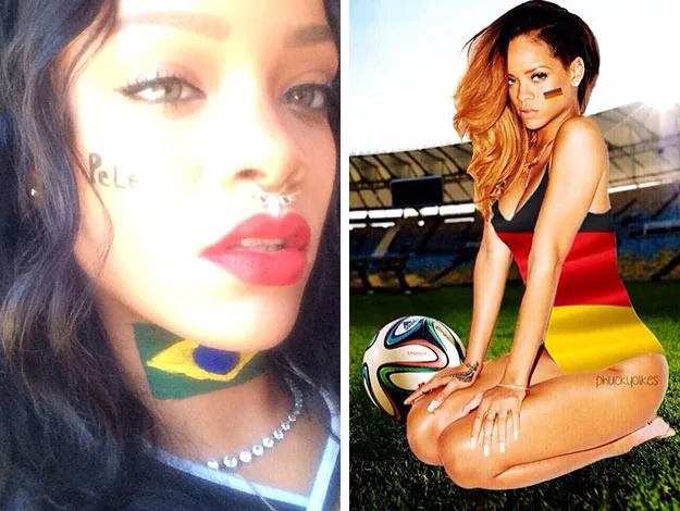 Rihanna seems to show support for ALL the teams. On the left is a picture she tweeted en route to the final with Brazilian flag painted on her neck. Afterwards though, when Germany won, she updated her Twitter profile image with a photoshopped image of her wearing a German flag.