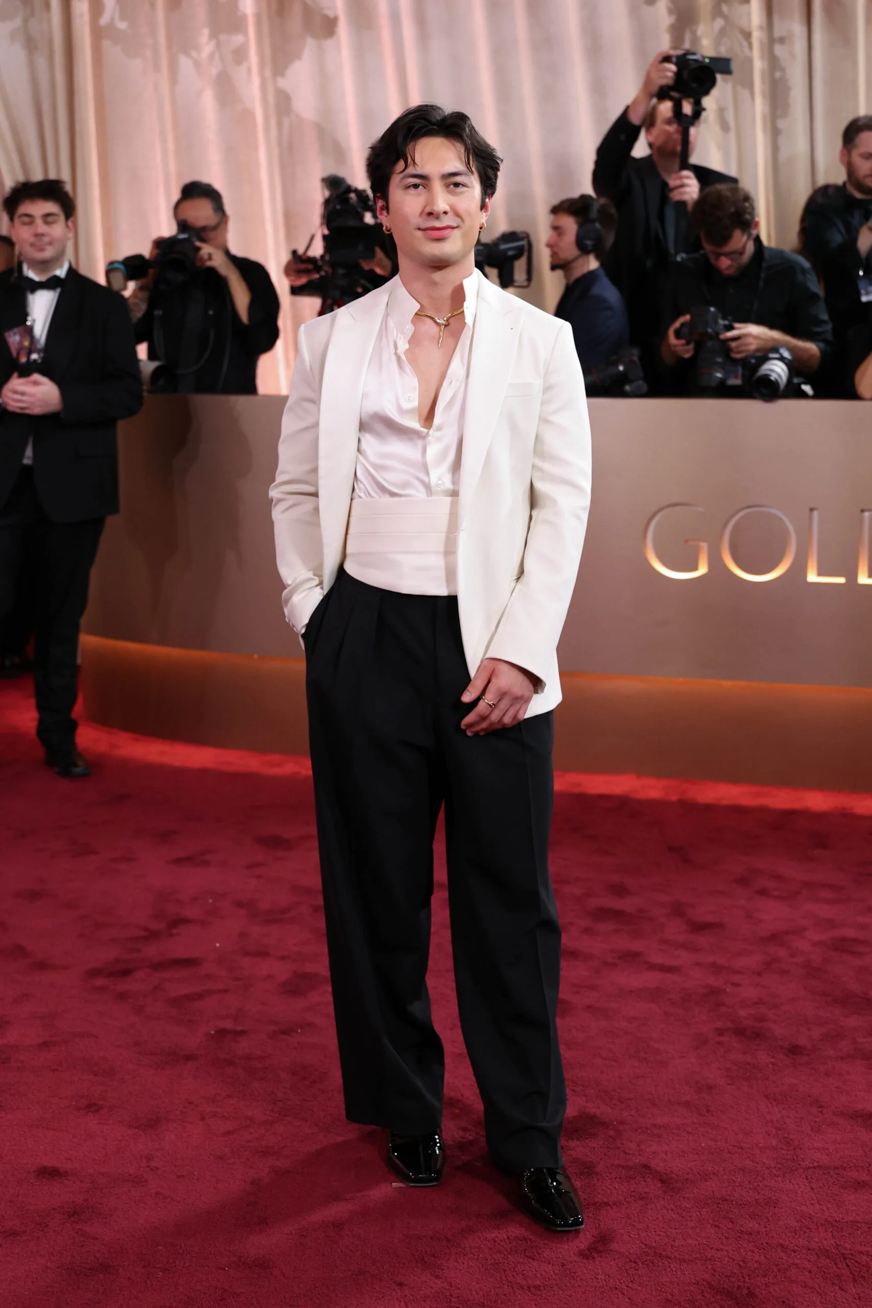 Here he is! Heated Rivalry star Connor Storrie is also making his Golden Globes debut after the success of the series in this British-mod inspired outfit.