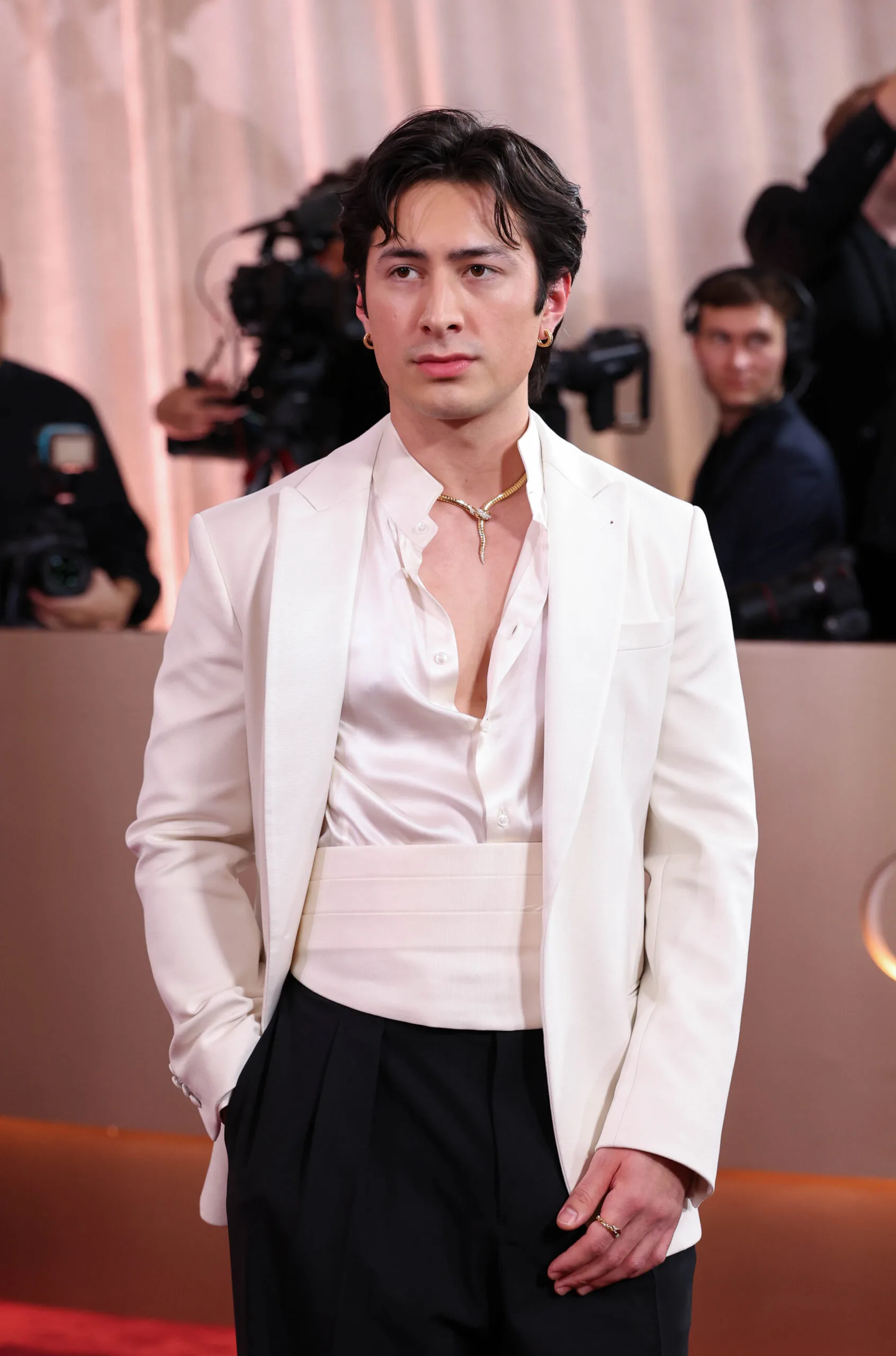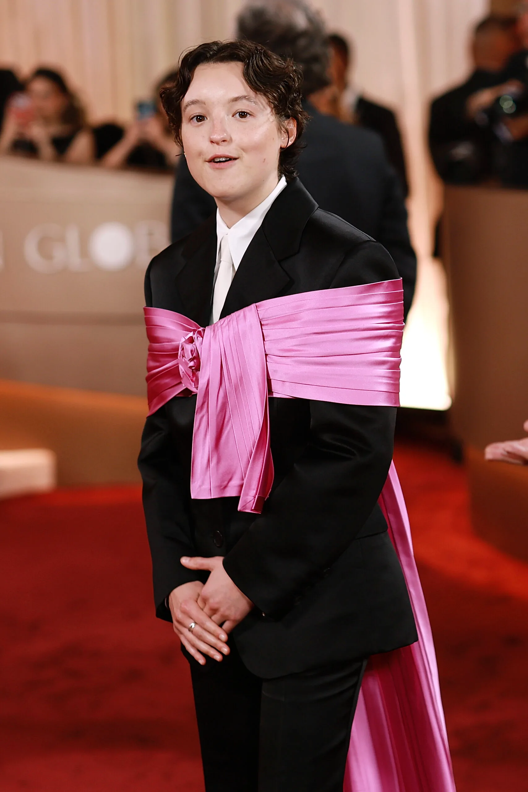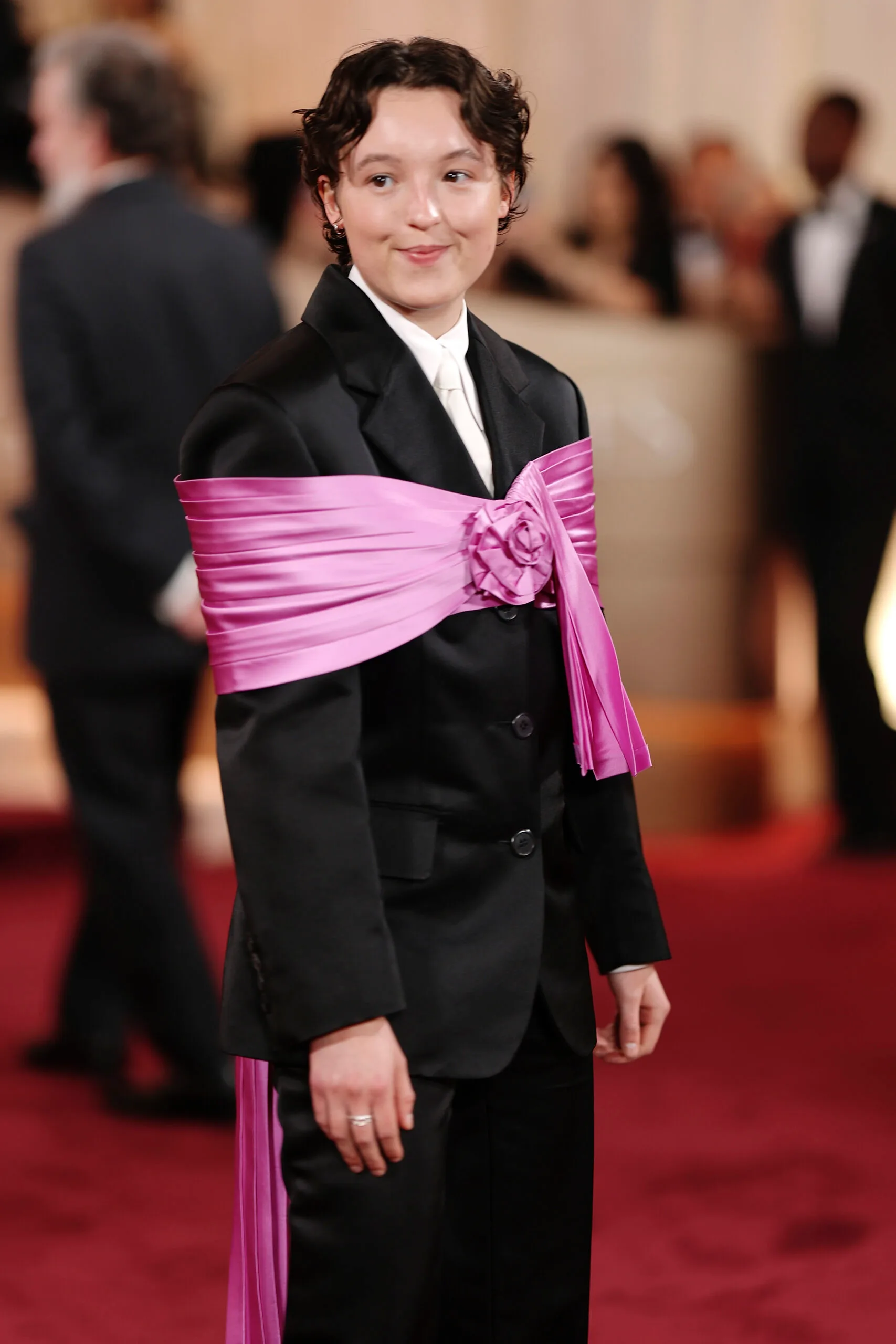 Bella Ramsay is taking a risk on the red carpet this year — and we love to see it! The Last Of Us star, who is up for Best Actress in a Television series, has amped up a typical black suit with a satin pink belt draped around their shoulders.