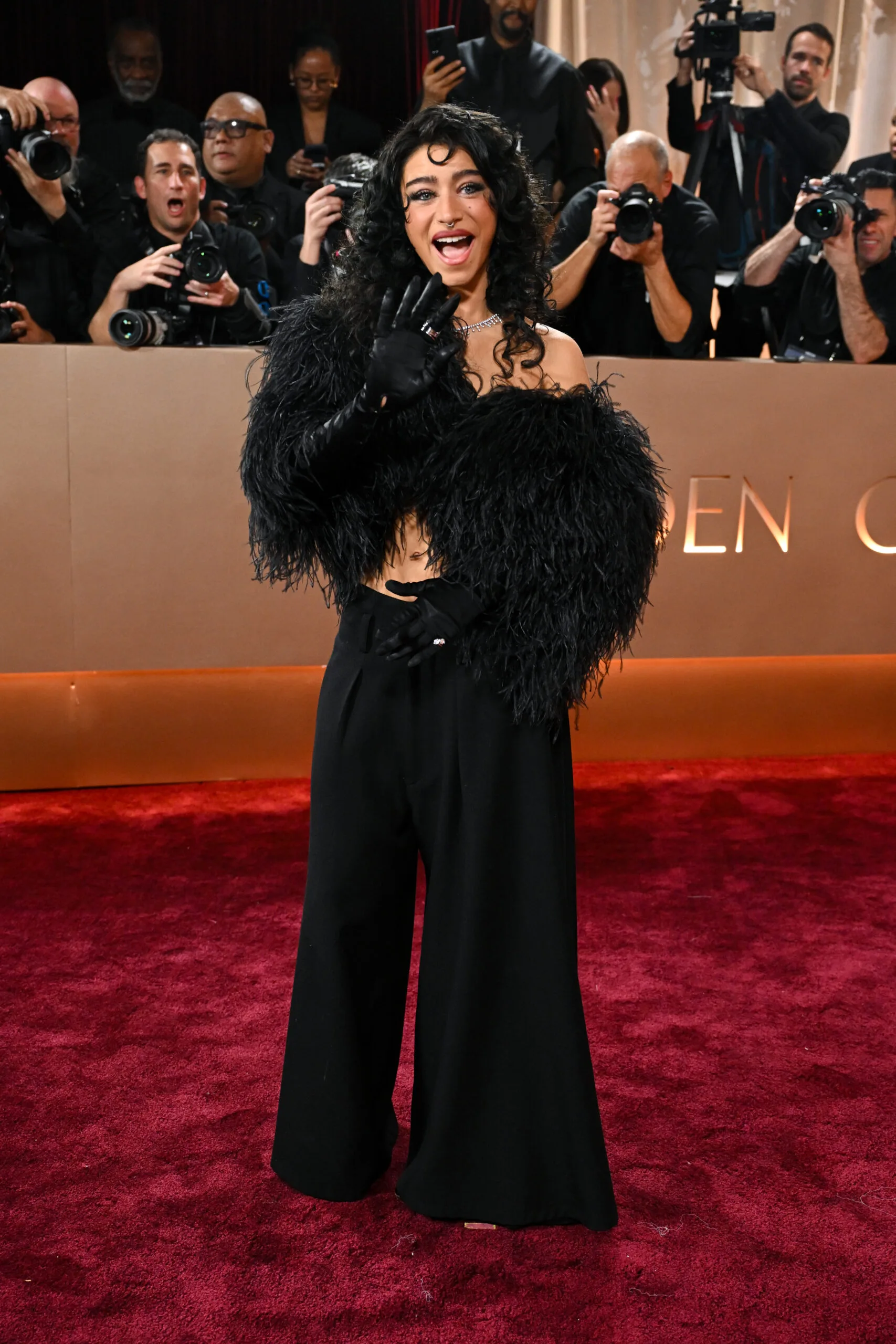 Odessa A’Zion is everywhere right now, and we can’t get enough of her! The Marty Supreme star looks impeccable with her signature curls, feathered top and black trousers on the red carpet.