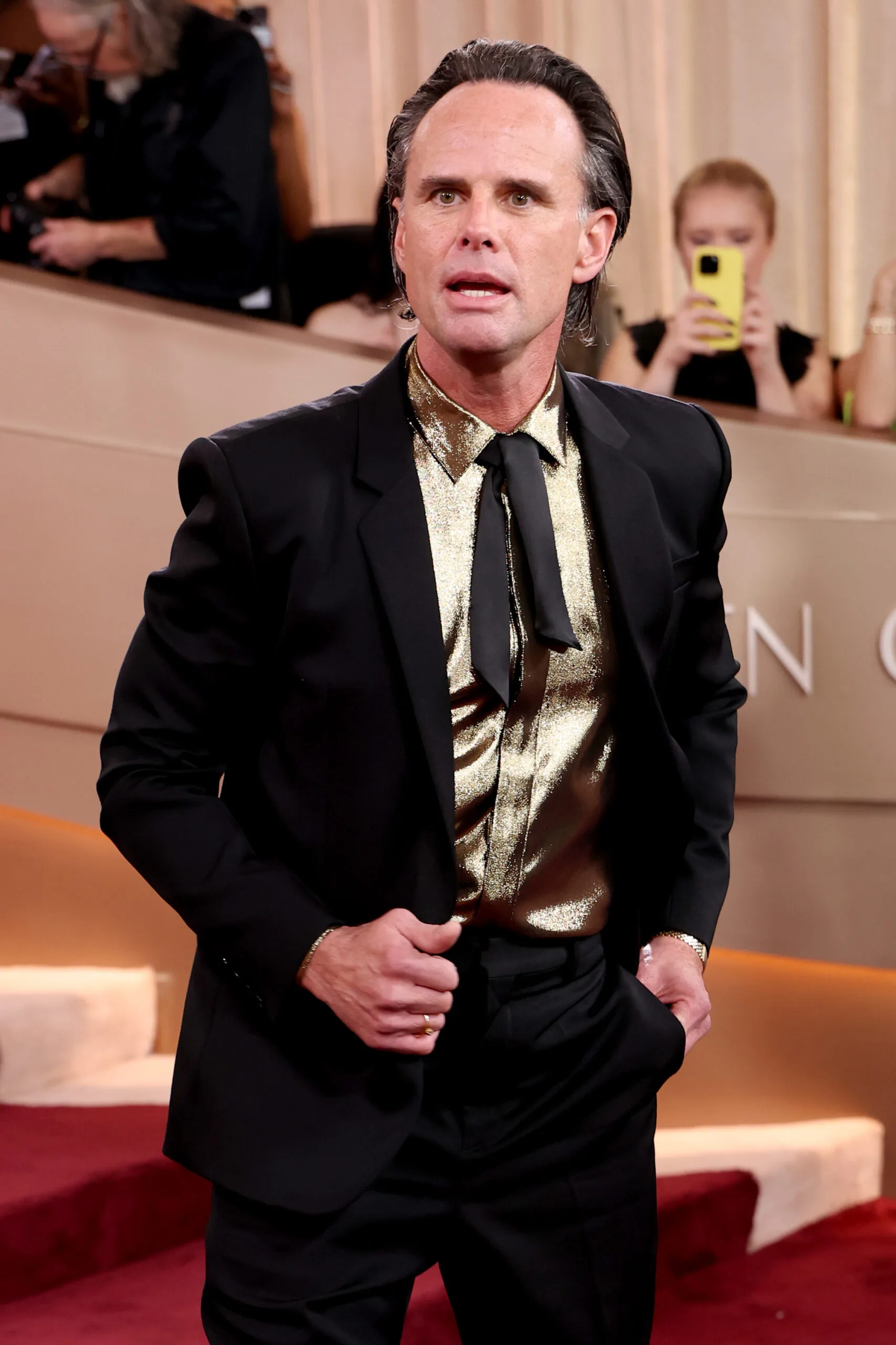 Walton Goggins knows how to work a red carpet. Not only does he always take risks in his fashion choices, but he always brings the energy. We can’t get enough of the golden shirt for the Golden Globes.