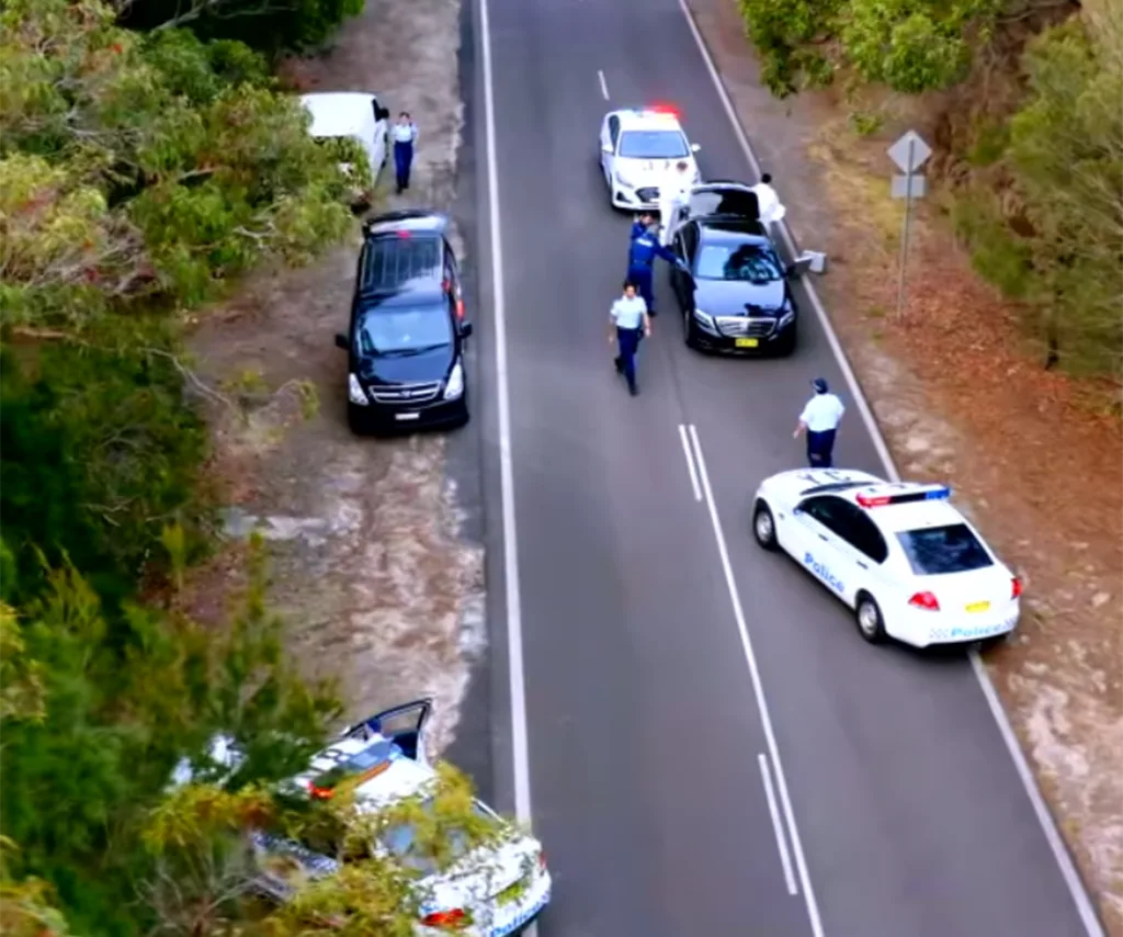 Mia is then intercepted by several police cars and taken away in handcuffs after cops search her car’s boot.