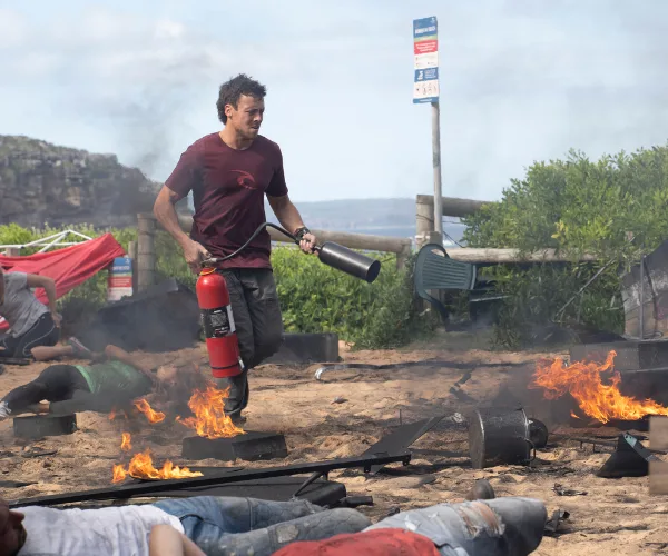 (Credit: Channel Seven)Amid the chaos and carnage in the immediate aftermath of the explosion, Dean (Patrick O’Connor) runs out of the surf club with a fire extinguisher to put out the flames.