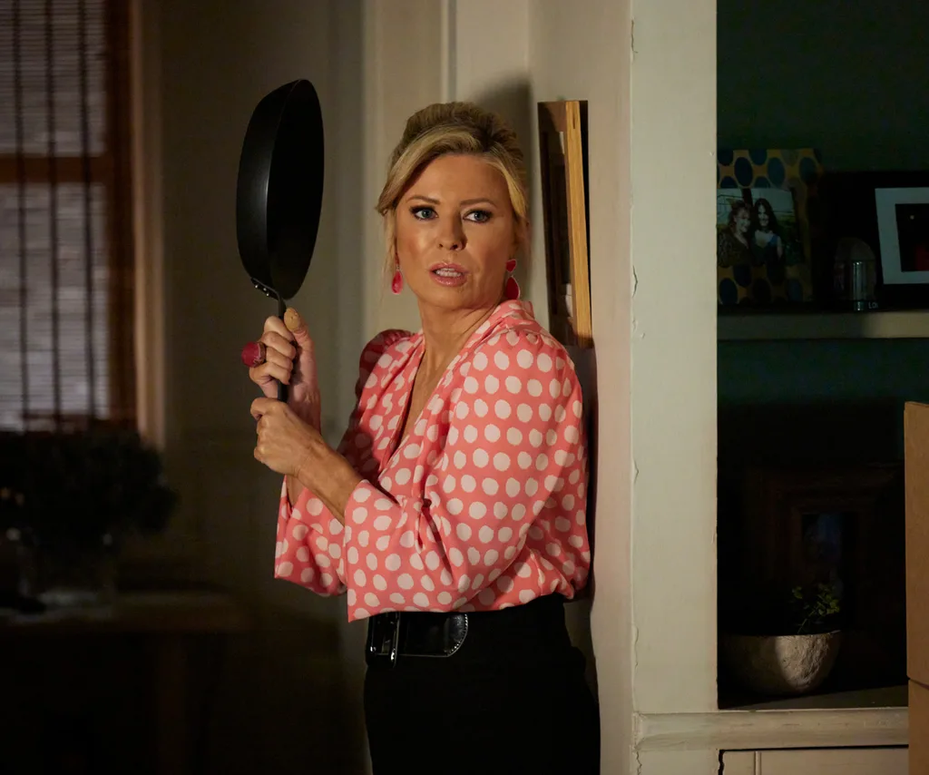 The fear is making her life unbearable. At work and at home, Marilyn constantly checks the locks, twitching at every sound. When she hears the front door rattle, she arms herself with a frying pan and hides. The door opens and in walks… Irene (Lynne McGranger)!